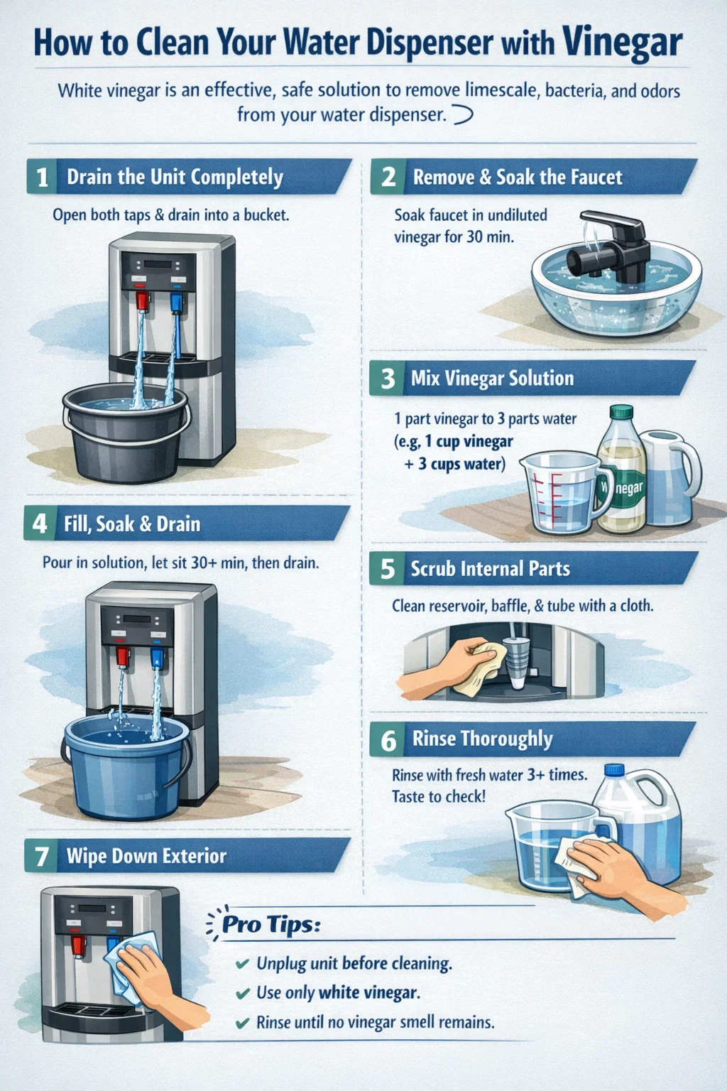 Kaedah pembersihan cuka teras digunakan untuk semua jenis dispenser, tetapi spesifikasinya berbeza-beza. Memahami reka bentuk unit anda memastikan anda tidak terlepas sebarang permukaan.