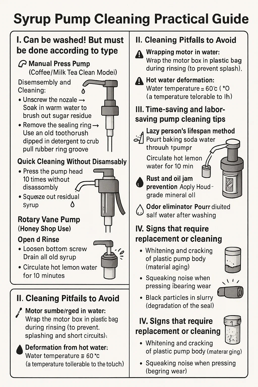 Sebelum menukar gula, tuangkan air soda baking melalui pam → gelembung membasuh filem gula. Gunakan beg penapis teh di atas muncung → untuk memintas kekotoran dan mengurangkan pembersihan.