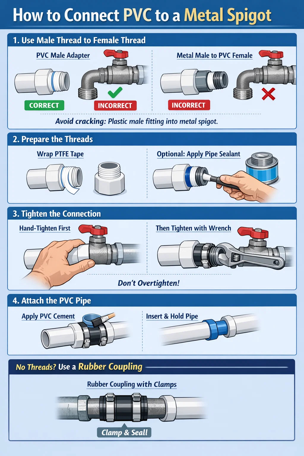 Menyambung paip PVC ke spigot logam (keran logam atau injap) adalah tugas biasa dalam pembaikan paip rumah. Disebabkan oleh kekerasan dan kadar pengembangan/penguncupan haba yang berbeza bagi plastik dan logam, penjagaan khas diperlukan semasa penyambungan untuk mengelakkan kebocoran atau kelengkapan retak.