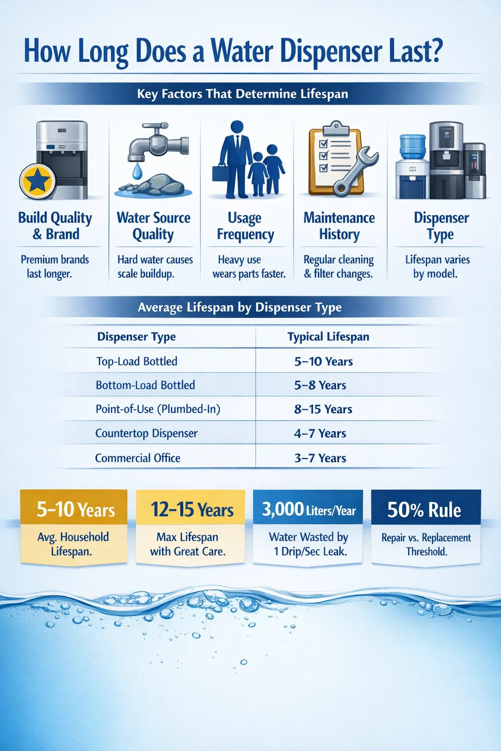 Tidak semua dispenser air berumur pada kadar yang sama. Beberapa pembolehubah memainkan peranan utama dalam berapa tahun yang anda boleh jangkakan secara realistik daripada unit anda sebelum prestasi menurun atau bahagian mula gagal.