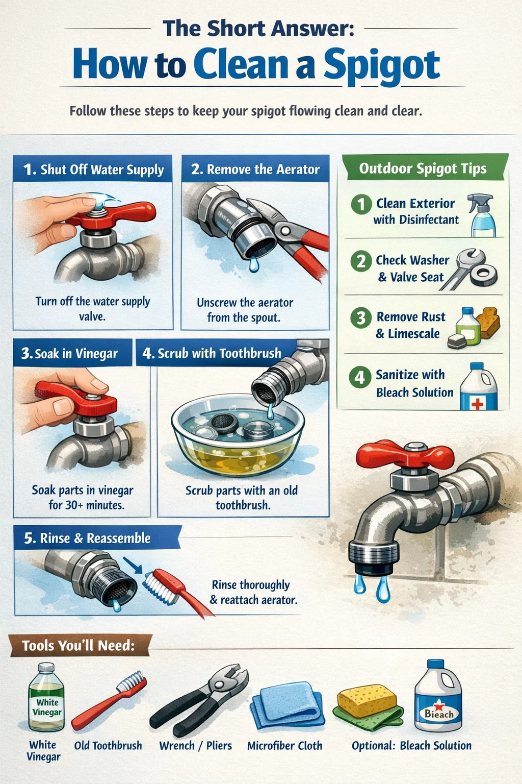 Panduan ini merangkumi segala-galanya: alatan yang anda perlukan, cara membersihkan pelbagai jenis spigot, cara menangani mendapan mineral yang degil, cara membersihkan paip luar dan cara mengekalkan spigot anda supaya tahan lebih lama.