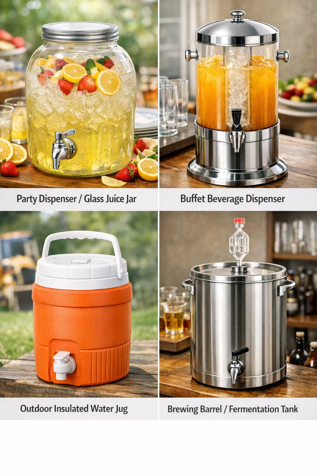 Istilah biasa: "Dispenser minuman," "dispenser jus" atau "dispenser minuman keluli tahan karat."
